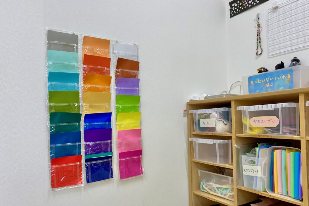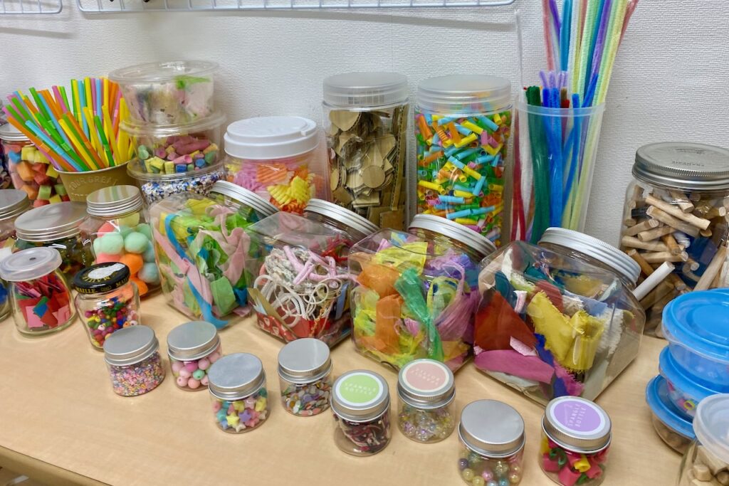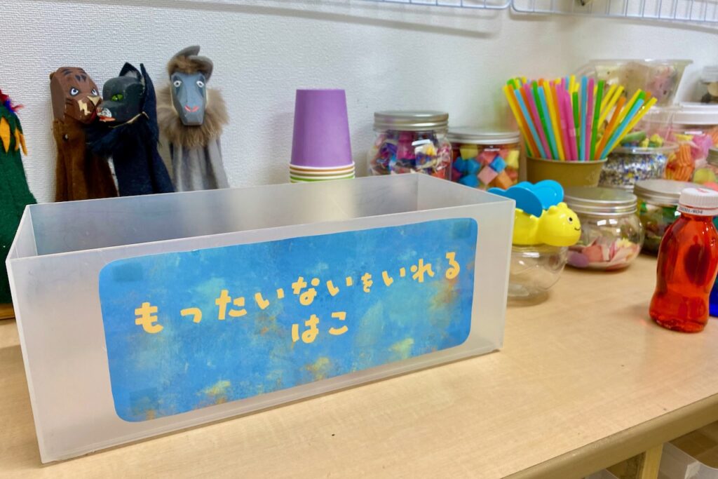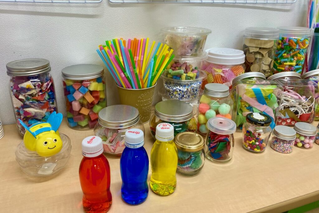 こういった素材を目にみえるところに並べておくと、先生もすぐに手に取ることができ使いやすいですし、子どもも素材を知り、どうやって遊ぼうか考える機会にもなります。