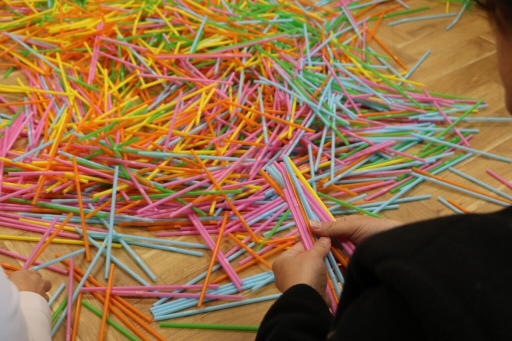 2500本って多いのではないかと思いましたが、実際に体験すると、この量があったからここまで楽しめたと気づきました。たくさんのストローにただ触れているだけで楽しく、黙々と集中できました。普段、コーナーを分けているので素材ごとに区別して遊ぶようにしてしまっていたり、ぴったりの数やギリギリの数で遊ぶことが増えていたと思い返しました。