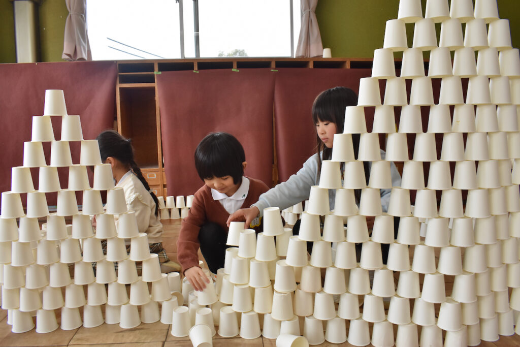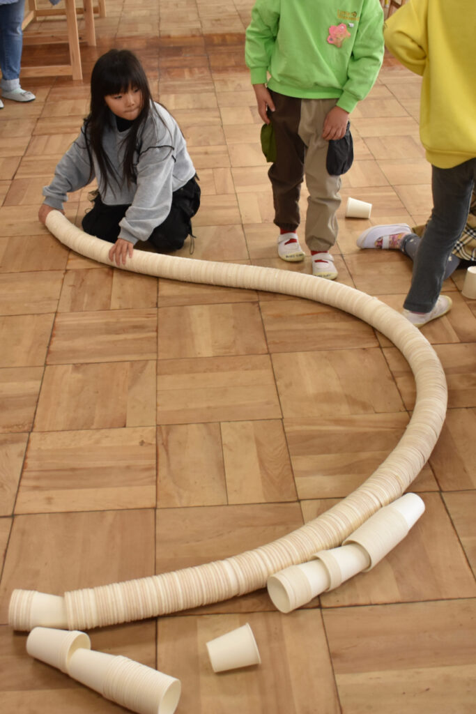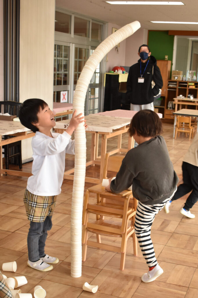 そして使い込んだ紙コップは柔らかさがあり、たくさん重ねると“くねくね”して、「ああっ!支えなきゃ!」と子どもたちは大喜び。