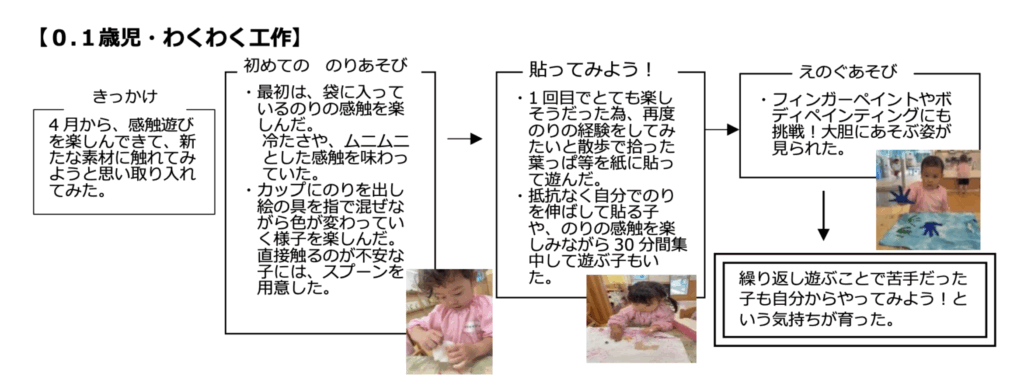 0・1歳児の事例では、はじめは“触れる”ことに不安を感じる子もいた「のり遊び」。先生の配慮(スプーンの用意など)によって、のりに触れることを楽しめる姿が見られるようになっていきました 。