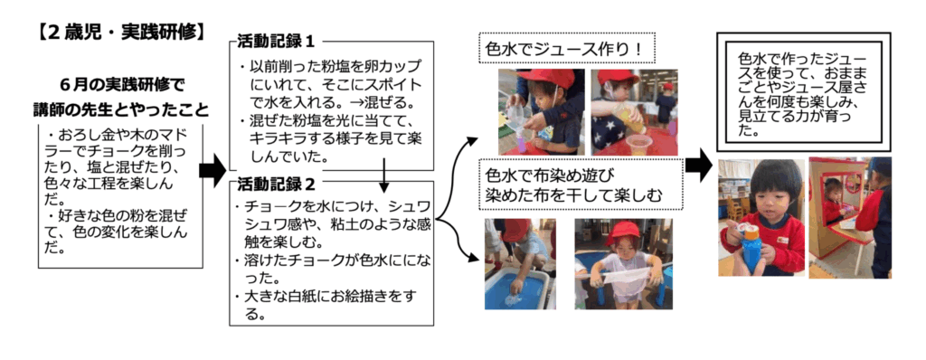 6月の2歳児さんとの『チョーク遊び』実践研修。これを研修の日だけで終わらせず、「継続した遊び」へと先生が展開させた様子が記されています。