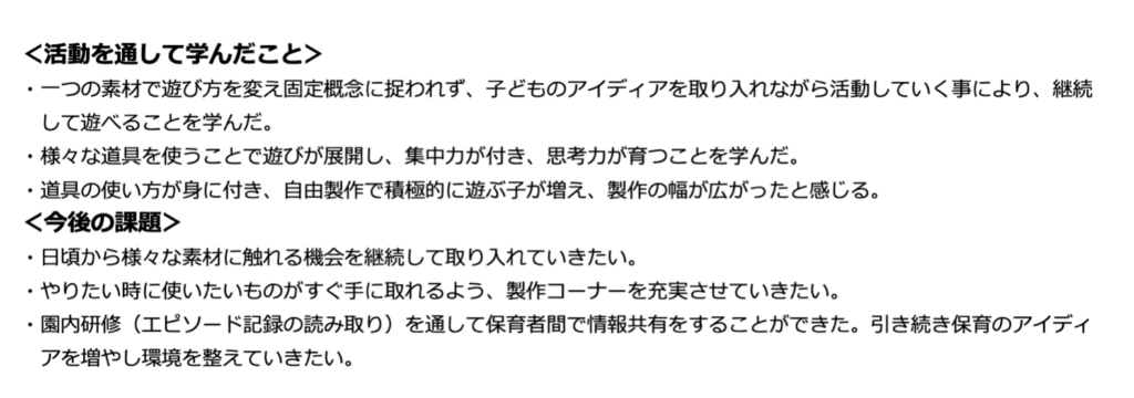 また、「自由製作で積極的に遊ぶ子が増え、製作の幅が広がった」という記述も、子どもたちが知識や経験を養う機会が日常的にあったからこその成長ですね。