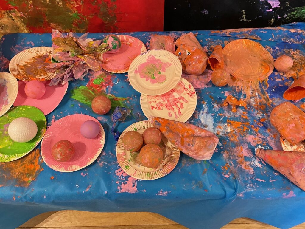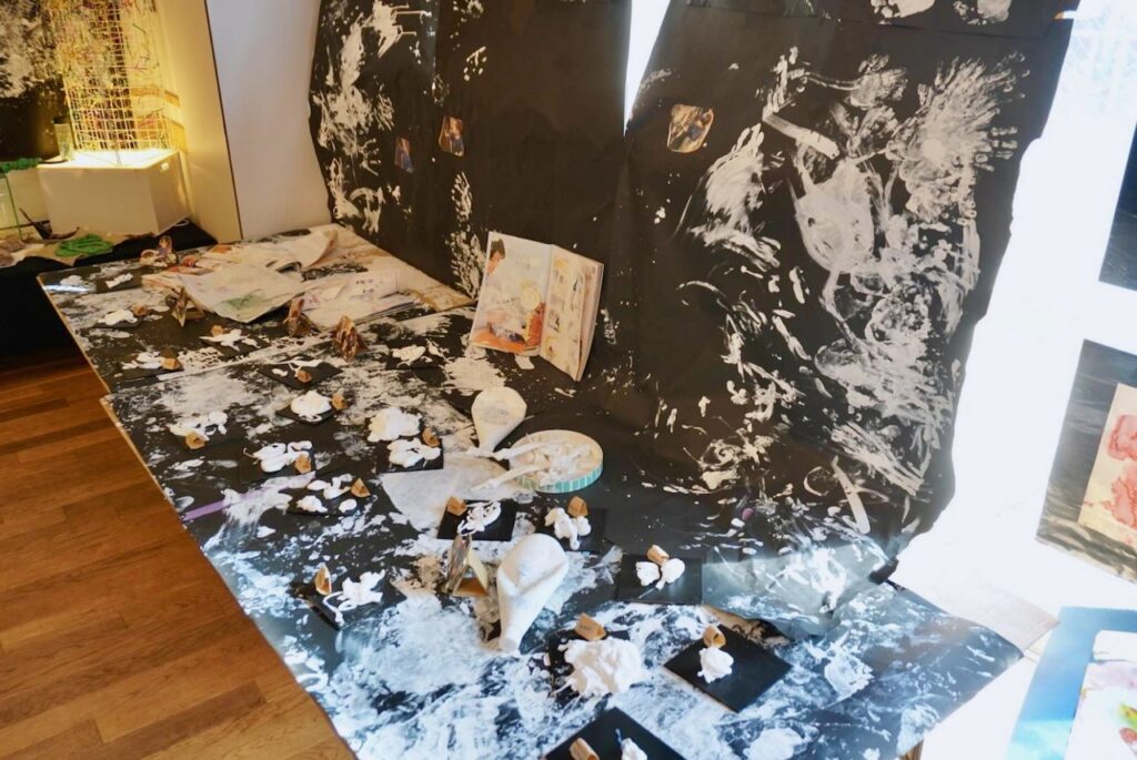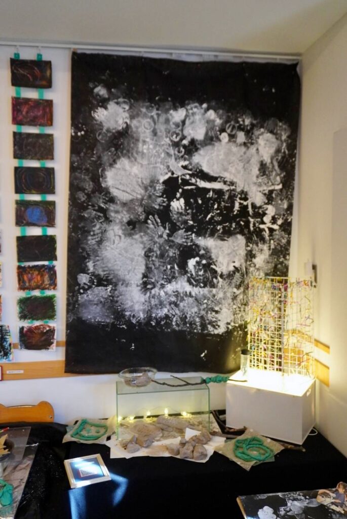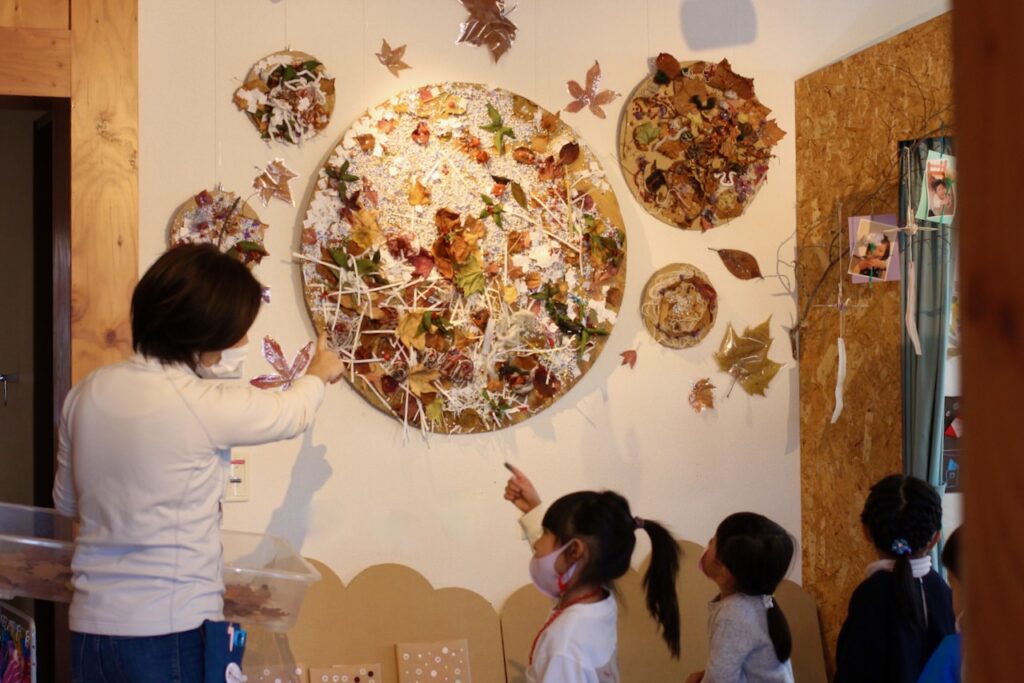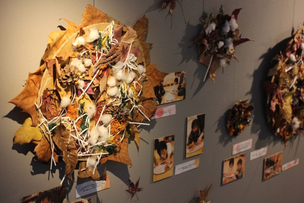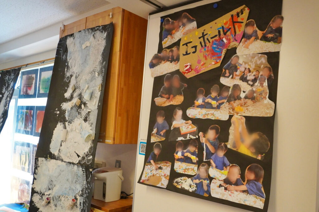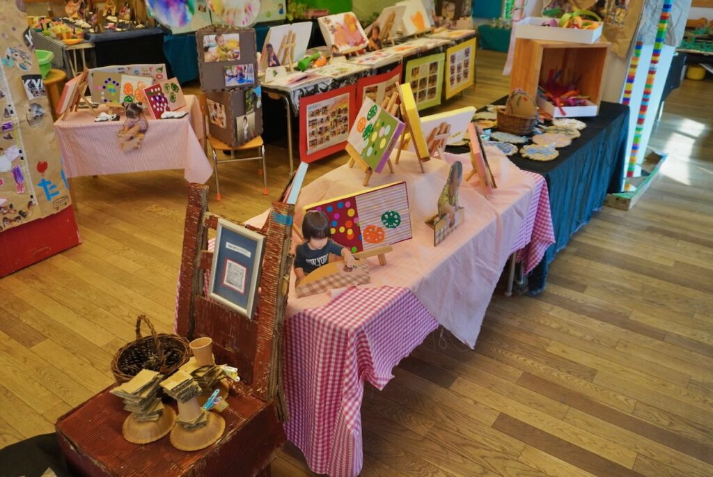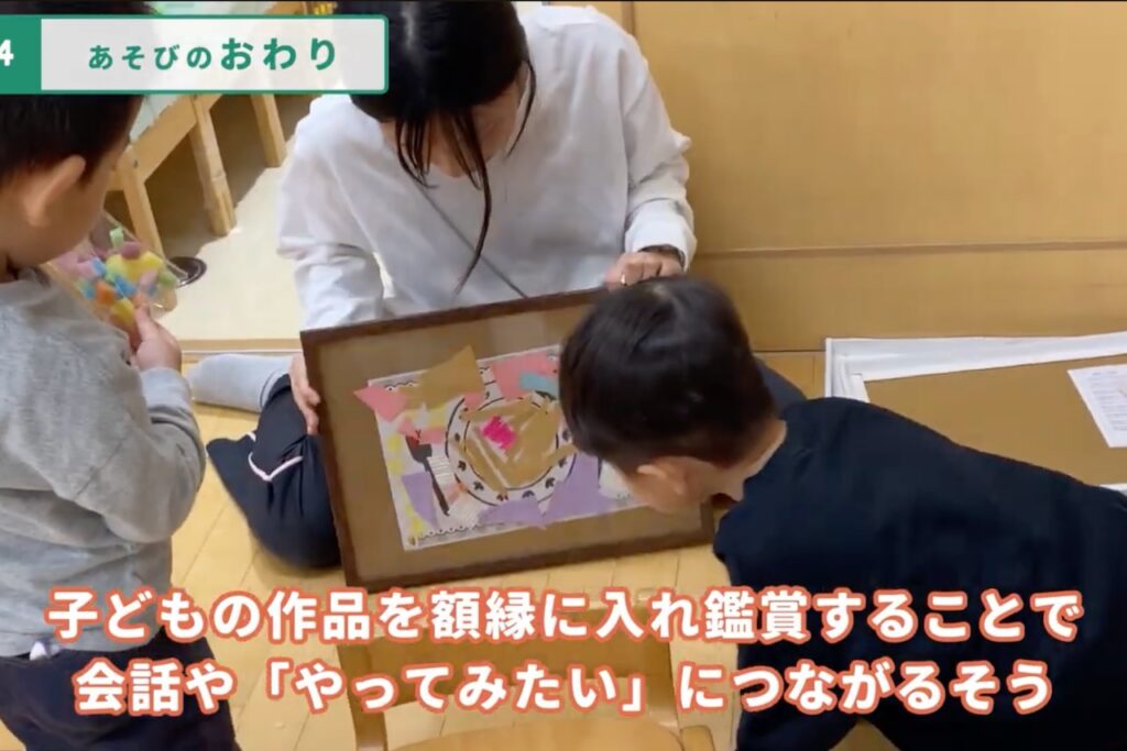 こでまりこども園あざわ様では、こうして子ども同士が鑑賞を通じて “遊びやコミュニケーションが広がるきっかけ”となる展示を大切にされており、その時々の遊びの痕跡を日常に飾っておられます。