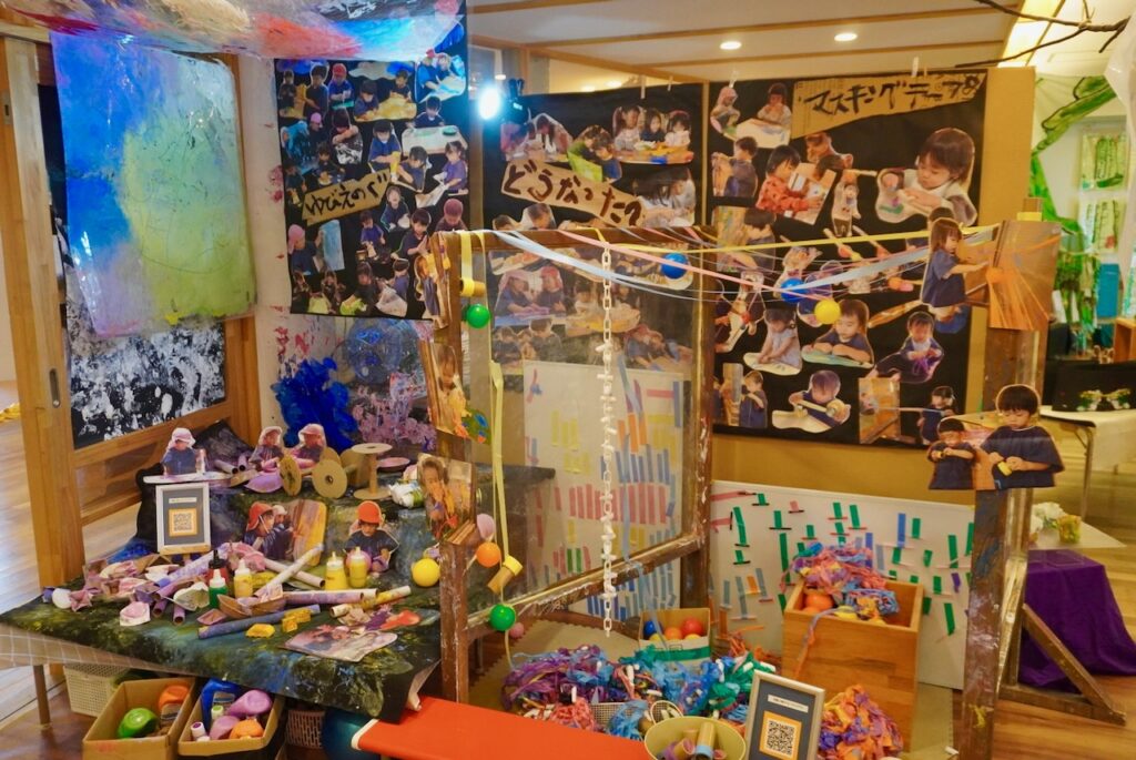 遊ぶ中での子どもの実際の姿を、写真、動画、ドキュメンテーションなどで、作品や遊びの痕跡とあわせて展示する方法は、見る人の心を動かします。QRコードを活用して動画などを見られるようにする工夫も、現代的な「可視化」のかたちで楽しさがありますね。