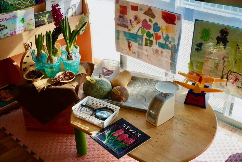 子どもたちの作品に繋がった植物なども置いています。虫眼鏡やスケール、図鑑も一緒に配置。子どもたちが「知りたい」と思った瞬間の空気感がそのまま伝わりますし、手にとってみたくなりますね。